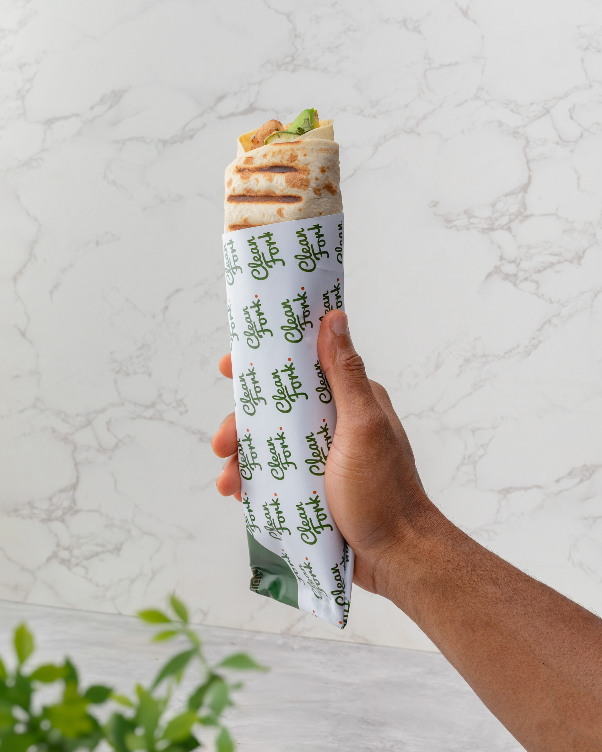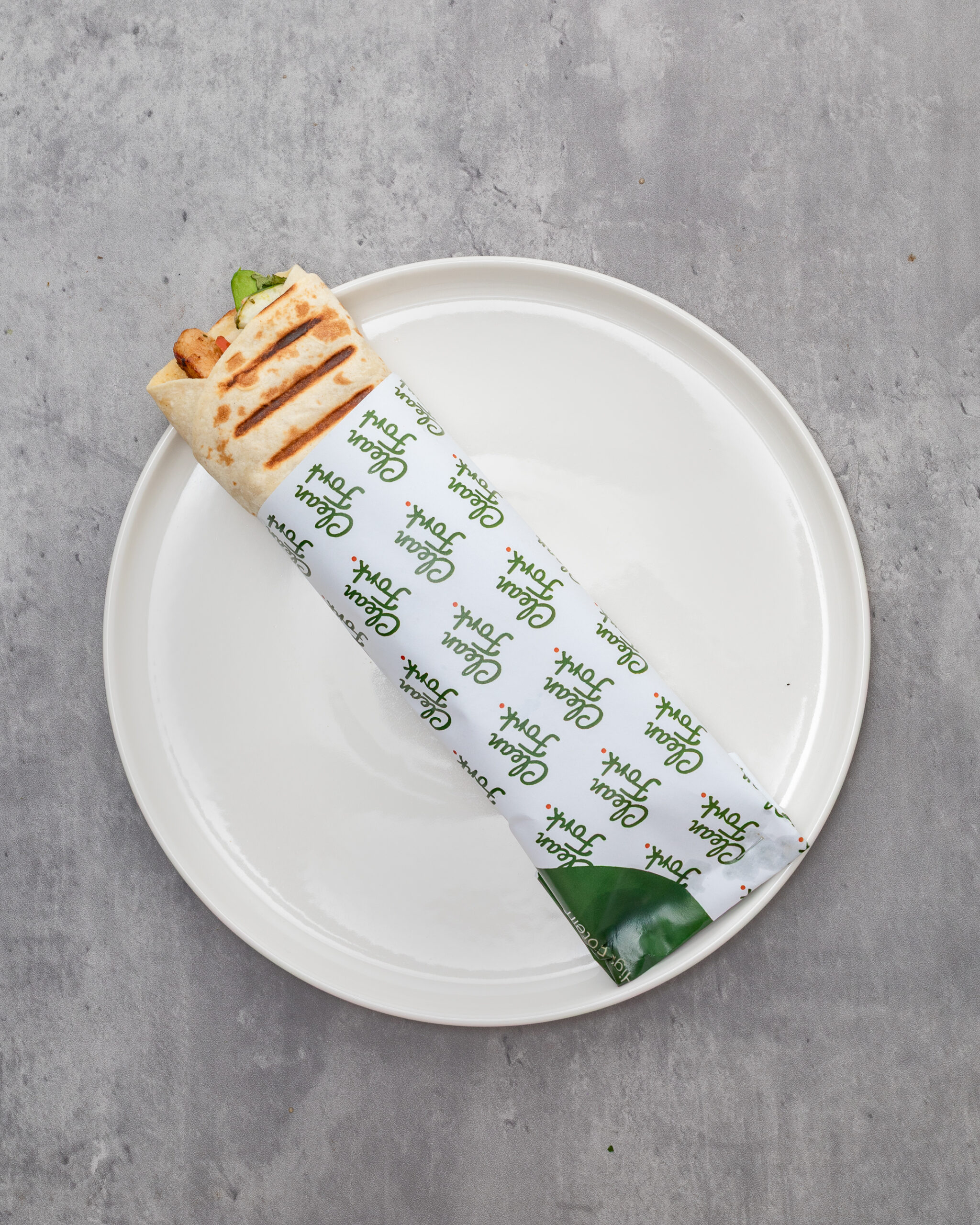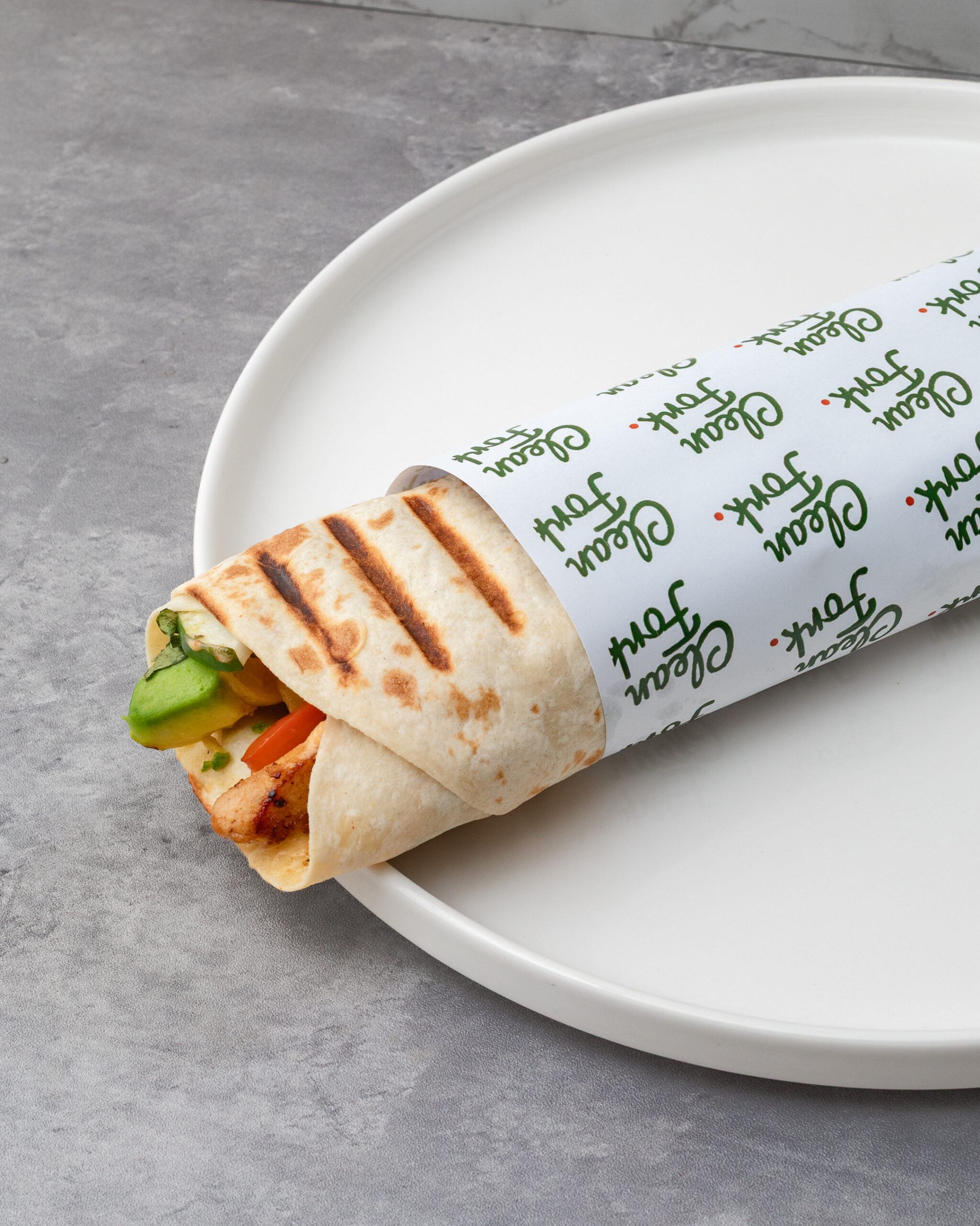 Whole-grain tortilla, grilled chicken strips, lettuce, tomato, light aioli