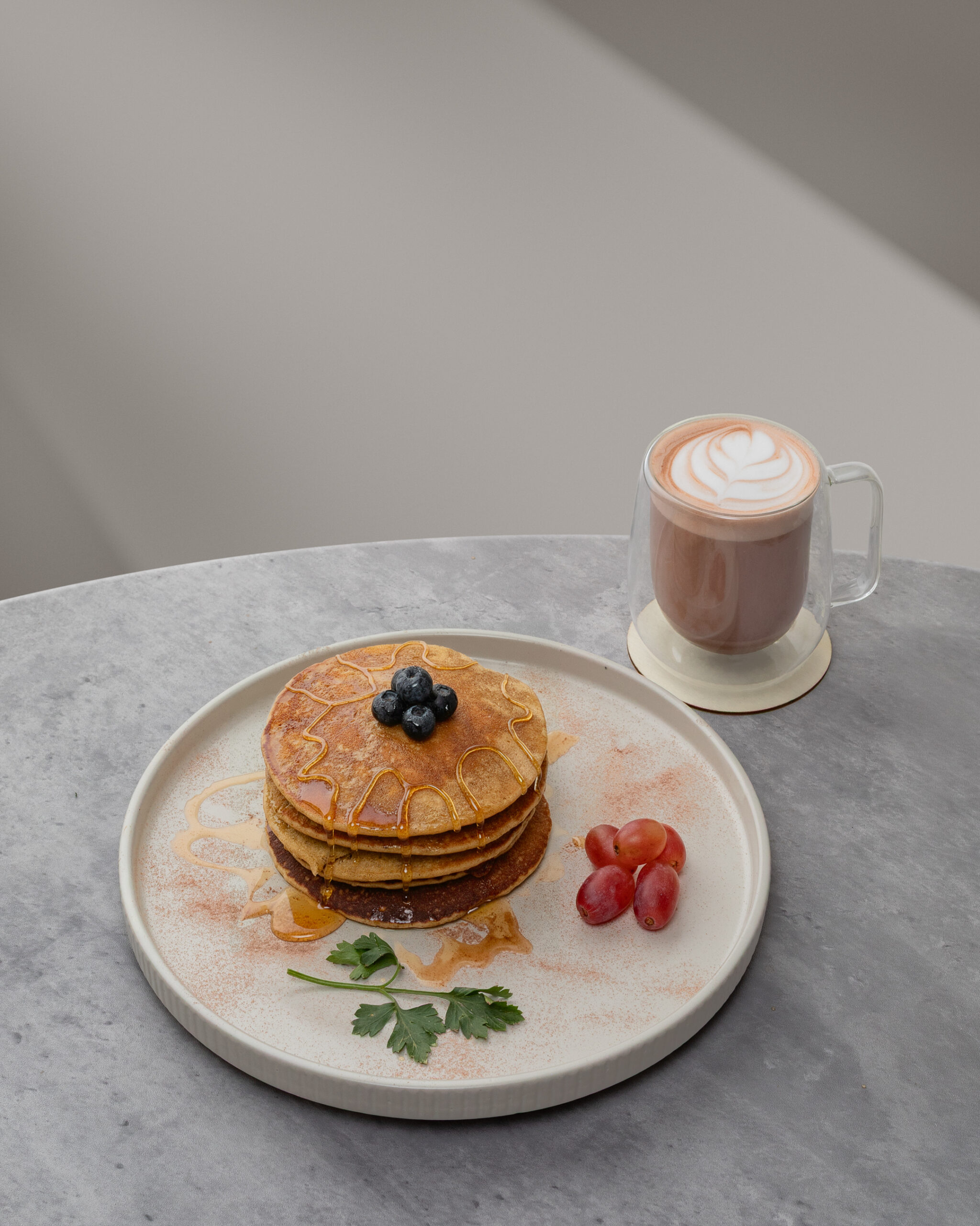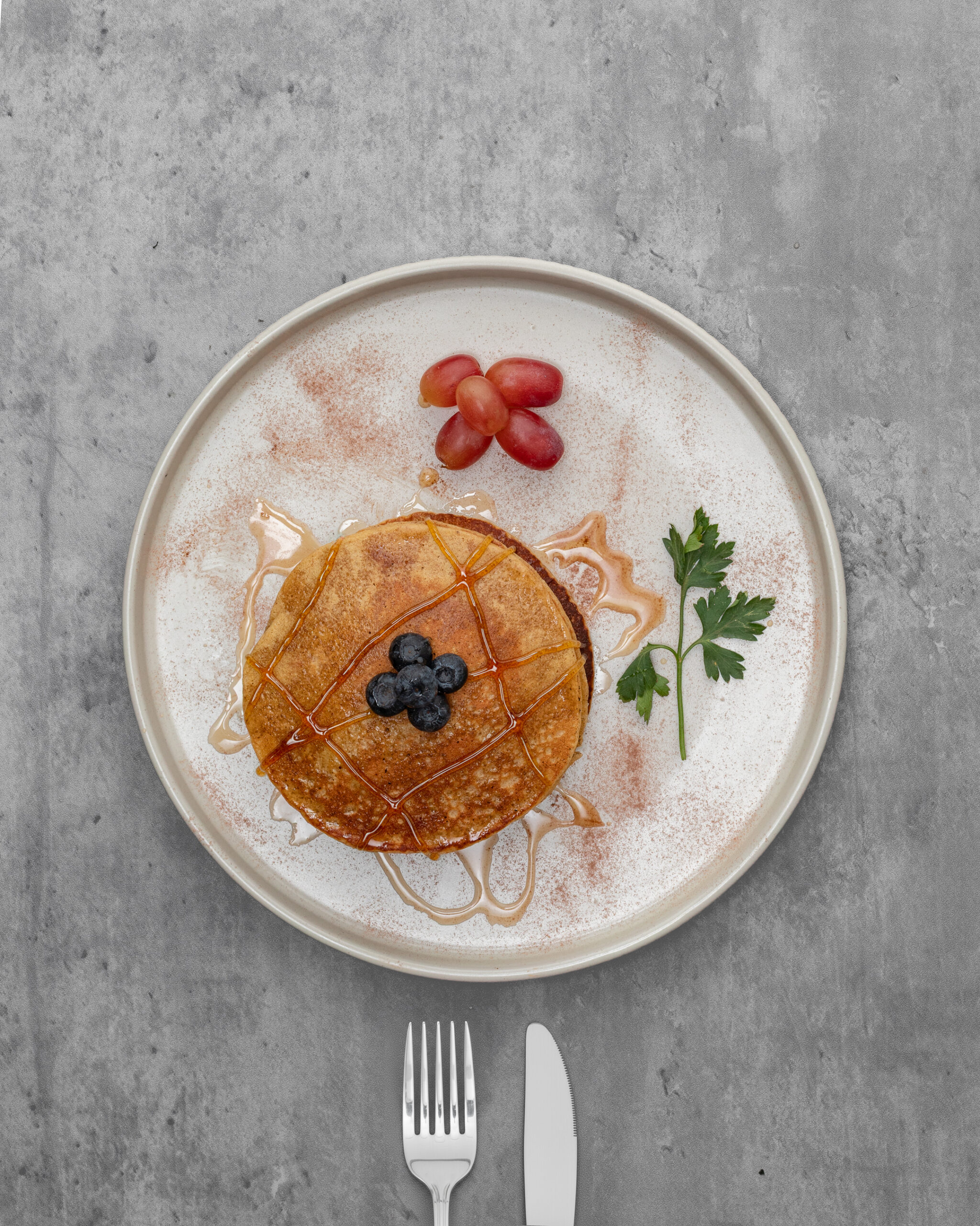 Fluffy oat-banana pancakes blended with whey protein powder and egg, topped with fresh berries & a light maple drizzle.